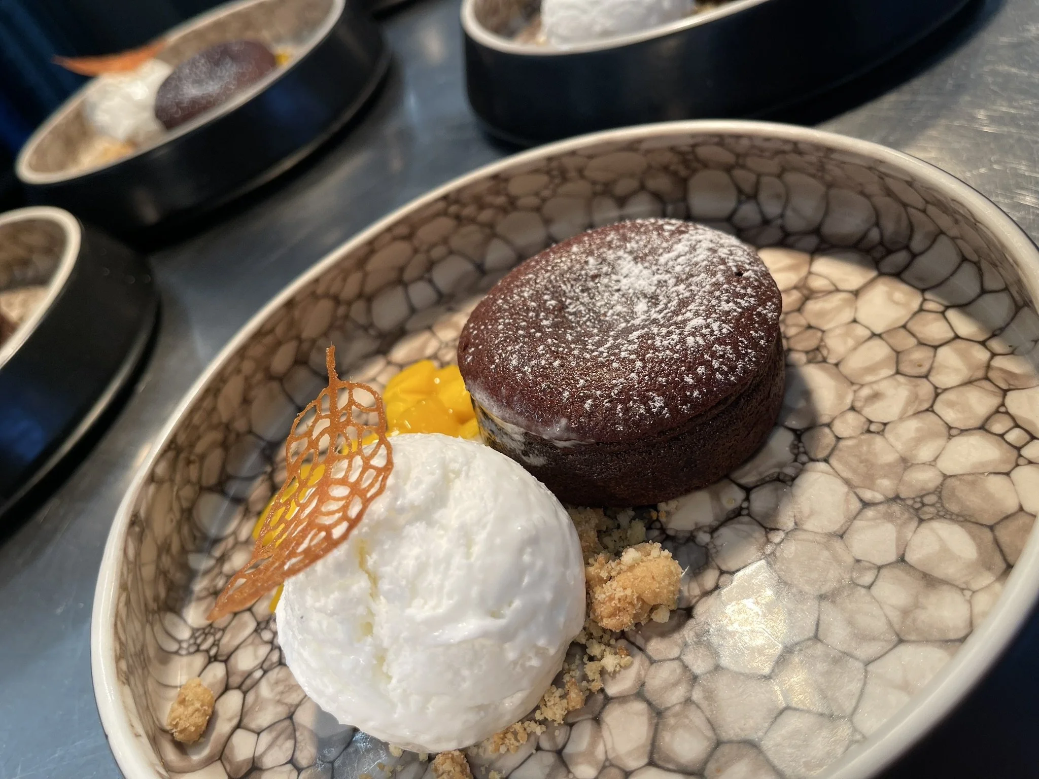 Schokoladensouffle mit hausgemachter Kokos-Eiscreme auf einem Spekulatius-Crumble und Mangosalat